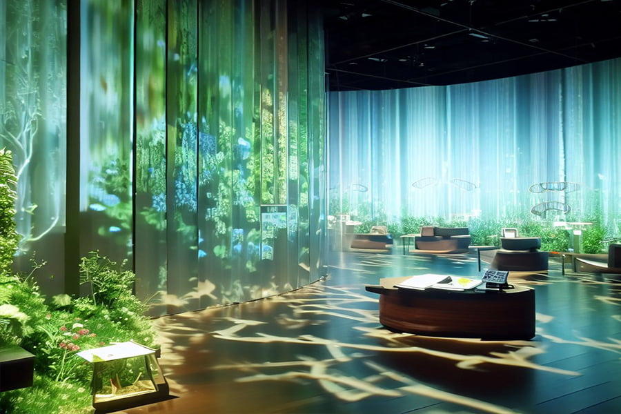 《生活之美》展示閱讀與生活之間關系的區(qū)域。該區(qū)域以花園為主題,利用真實植物、花卉投影、香氛噴霧等多媒體設備,營造出一個清新優(yōu)雅、生機盎然的生活花園。參觀者可以在這里欣賞各種與生活相關的美好內容,如詩歌、散文、小說、電影等,并通過互動拍照、寫作分享等方式記錄自己的生活感悟。該區(qū)域的設計意圖是讓參觀者感受到生活的美好和幸福,激發(fā)他們對生活的熱愛和享受。